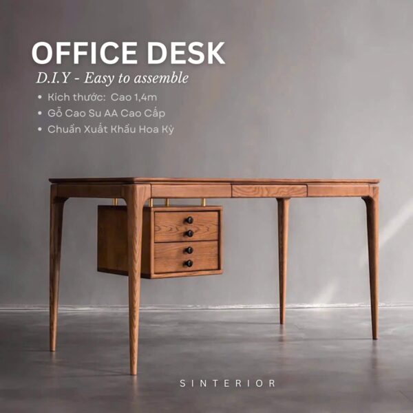 Chiếc bàn làm việc bằng gỗ cao su theo tone màu walnut tần bì mang phong cách cổ điển, với những đường nét trang nhã và phụ kiện bằng kim loại tinh tế—một kiểu dáng cổ điển, vượt thời gian sẽ làm hài lòng những người đam mê đồ nội thất cổ điển.