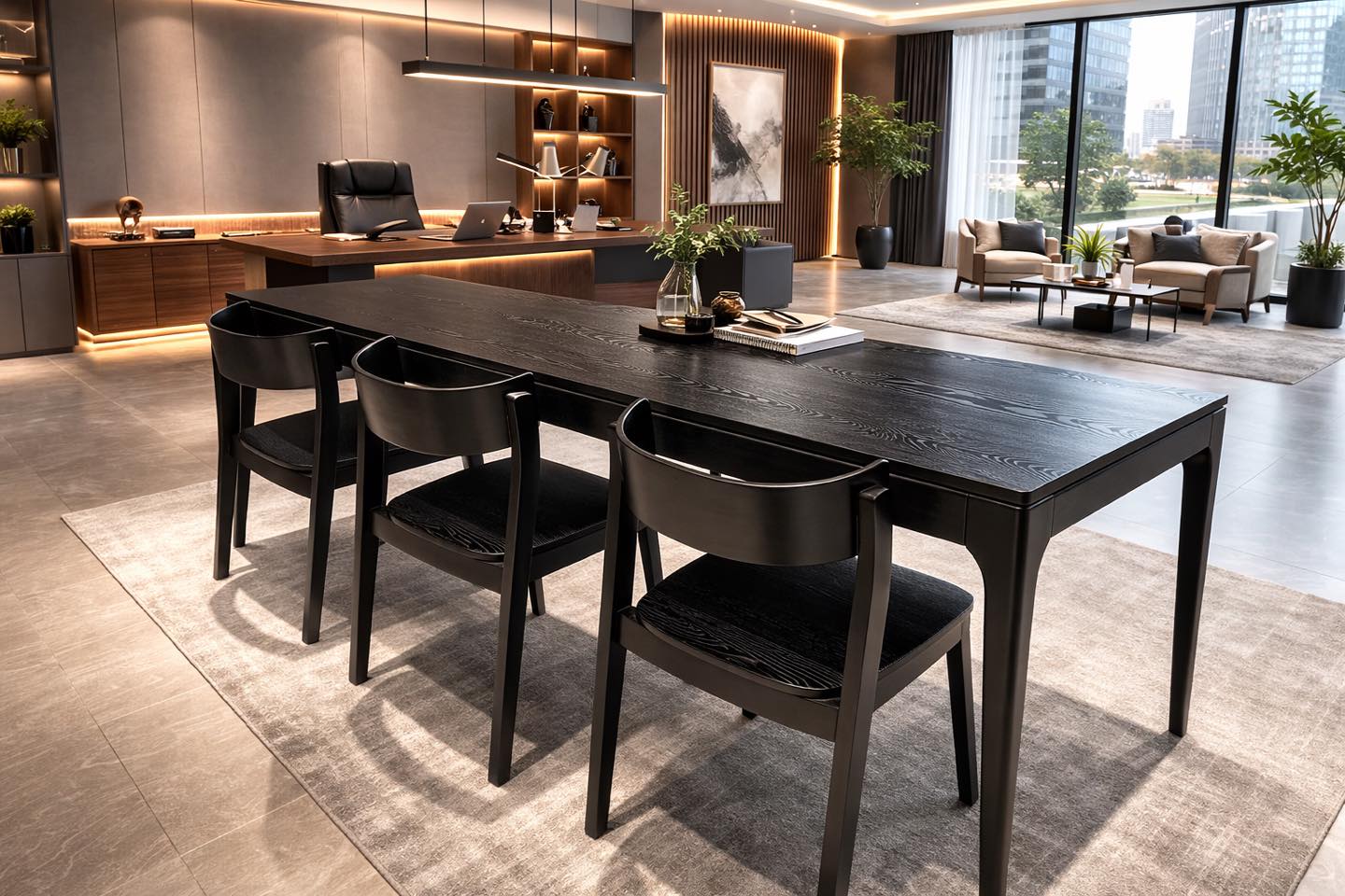 - Integrated curved chairs → harmonized, minimalist Japanese–Scandinavian style