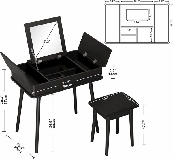 𝐆𝐢𝐨̛́𝐢 𝐭𝐡𝐢𝐞̣̂𝐮 𝐯𝐞̂̀ 𝐬𝐚̉𝐧 𝐩𝐡𝐚̂̉𝐦: Thiết kế 2 trong 1 – Bạn sẽ sở hữu một chiếc bàn trang điểm có chức năng như một chiếc bàn làm việc. Lật nắp bàn lên, bàn sẽ có ngay một chiếc gương trang điểm chính xác theo đúng hướng và bạn có thể nhìn thầy mình trong gương một cách hoàn hảo khi ngồi thoải mái. Sau khi sử dụng xong, hạ phần gương xuống, bạn lập tức lại có một bàn làm việc tiện dụng. Chắc chắn và đa năng – set bàn trang điểm bao gồm bàn và ghế trên sẽ là sự lựa chọn hàng đầu dành cho bạn.