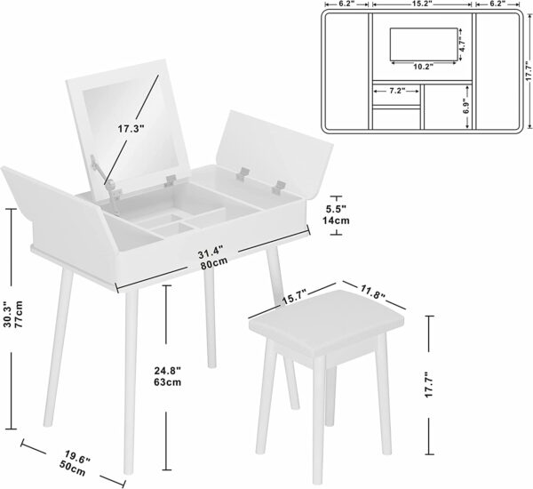 𝐆𝐢𝐨̛́𝐢 𝐭𝐡𝐢𝐞̣̂𝐮 𝐯𝐞̂̀ 𝐬𝐚̉𝐧 𝐩𝐡𝐚̂̉𝐦: Thiết kế 2 trong 1 – Bạn sẽ sở hữu một chiếc bàn trang điểm có chức năng như một chiếc bàn làm việc. Lật nắp bàn lên, bàn sẽ có ngay một chiếc gương trang điểm chính xác theo đúng hướng và bạn có thể nhìn thầy mình trong gương một cách hoàn hảo khi ngồi thoải mái. Sau khi sử dụng xong, hạ phần gương xuống, bạn lập tức lại có một bàn làm việc tiện dụng. Chắc chắn và đa năng – set bàn trang điểm bao gồm bàn và ghế trên sẽ là sự lựa chọn hàng đầu dành cho bạn.